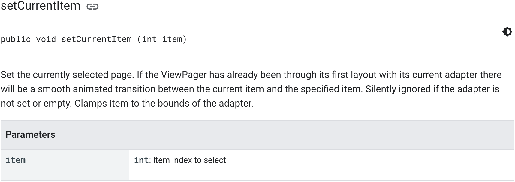 참고로 setCurrentItem()은 인자값을 1개 또는 2개로 사용할 수 있는데 테스트해보니